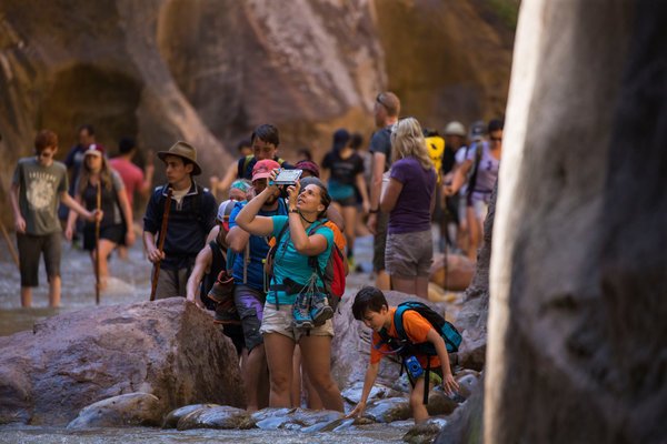 Shuttle buses at Zion National Park, in southwest Utah, filled like sweaty subway cars. Selfie-takers clogged the slender path through the Narrows slot canyon, one of the park’s best-known attractions. And at the top of Angels Landing, an iconic trail of switchbacks on the east side of the park, some portable toilets were marked off with a sign: “Due to extreme use, these toilets have reached capacity.”