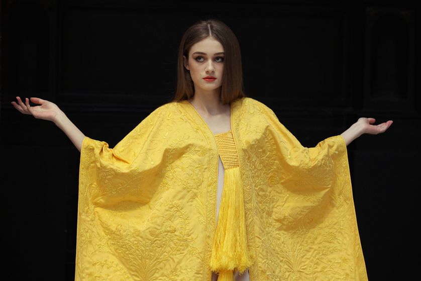 This cape was hand-embroidered from the silk of 1.2 million golden orb-weaver spiders, a process that took eight years. The bright yellow color is reportedly the natural color of the spiders' silk. (Photo: Oli Scarff/Getty Images)
