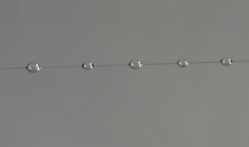 Beads of spider glue cling to a strand of capture-spiral silk. (Photo: Sarah Stellwagen [CC BY-ND 4.0]/The Conversation)