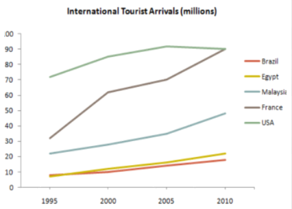 The number of tourists visiting Malaysia rose steadily over the whole period but by 2010 the total was still under 50 million. The countries with the fewest tourist arrivals were Brazil and Egypt. The number of tourists going there was similar between 1995 and 2000 but after that there was a greater increase in tourists going to Egypt than to Brazil.
