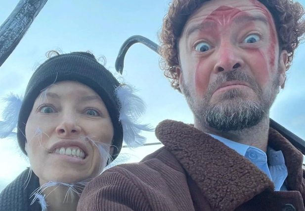 In a photo shared to both stars' Instagram pages on Oct. 31, the "SexyBack" singer, 41, took on the role of the tall and dim-witted thief Marv, originally played by Daniel Stern, wearing a brown corduroy jacket and paint resembling a hot iron on his face. The actress, 40, portrayed Joe Pesci's short and hot-headed burglar character Harry, sporting a black knit cap and scarf with feathers stuck to her face and head.