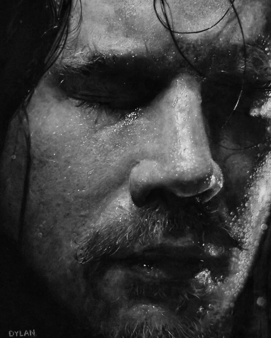 木炭是我使用的主要媒介,石墨用于更精细的细节。每隔一段时间,我都会用白色的小点来做高光。
