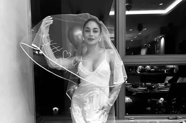 The High School Musical actress smiled while gracefully lifting the headpiece as she wore gloves and a bridal gown. A pair of balloons were seen floating just behind her.